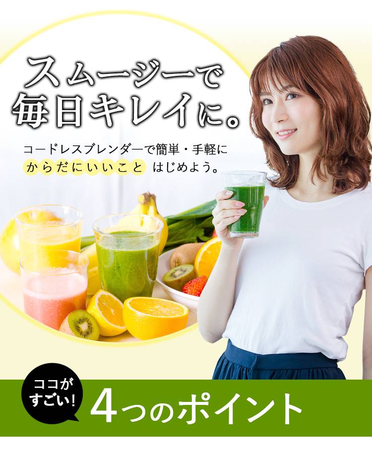 ■氷も砕ける! 氷はもちろん、凍らせたフルーツもちゃんと砕けて、簡単に冷たいアイススムージも作れます! ■充電式のコードレス! 充電式のコードレスタイプなので、使用する場所を選びません。