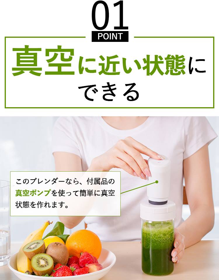 ミキサー・フードプロセッサー【父の日プレゼント 父の日ギフト sale スーパーセール】【おすすめ】【オススメ】【母の日】【父の日】【敬老の日】【プレゼント】【通販】【ボーナス特集】充電式でいつでもどこでも使用可能! 真空保管も可能な充電式コードレスボトルブレンダー ■真空に近い状態で保存できる! 今までは新鮮な食材を使用しても、カットして空気に触れたときから酸化してしてしまい、すぐに変色していましたが、付属の真空ポンプを使用して真空に近い状態にすると、酸化のスピードを遅らせ、鮮やかな色を長く保つことができます。