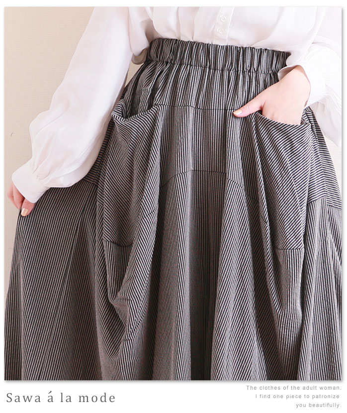 サイズ ウエスト:29cm 伸ばして48cm着丈86cm ヒップ102cm裾幅69cm 股下37cm 素材 ポリエステル 97% ポリウレタン 3%備考ITEM DETAILS 商品コメント落ち着いたカラーのストライプ模様。