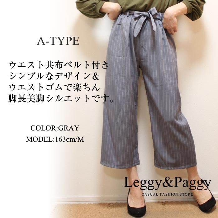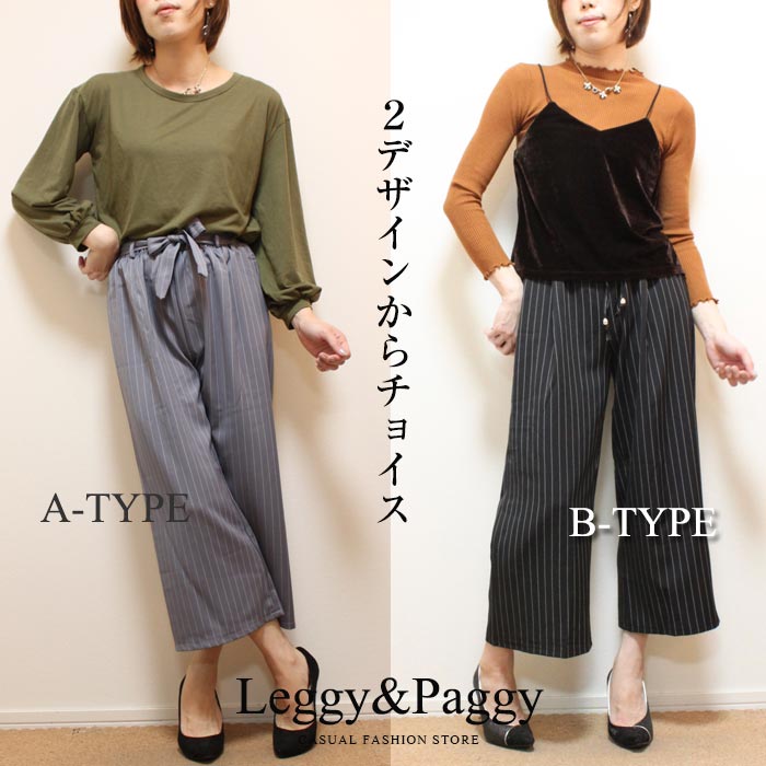 ロングワイドパンツ 選べる2デザイン! アンクル丈の大人ワイド! オフィスコンサバな着こなしにも! ウエストデザインが違う2型からチョイス 商品名 ワイドパンツ(リボンベルト付き:Aタイプ かざりリボン付き:Bタイプ) 素材・材質 ポリエステル100%裏地なし カラー ネイビー グレー ブラック 商品特長 すらっとすっきりシルエット! ストライプできちんと感とすらっと感を演出。
